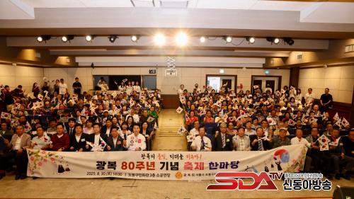 µµºÀ±¸ ±¤º¹ 80Áֳ⠱â³äÇà»ç¿¡¼­ Âü¼®ÀÚµéÀÌ ´Ù °°ÀÌ »çÁøÀ» Âï°í ÀÖ´Ù(2025. 8. 30. µµºÀ±¸¹Îȸ°ü 3Ãþ ¼Ò°ø¿¬Àå)(»çÁø °¡¿îµ¥ Èò»ö ¿Ê ¿À¾ð¼® µµºÀ±¸Ã»Àå)