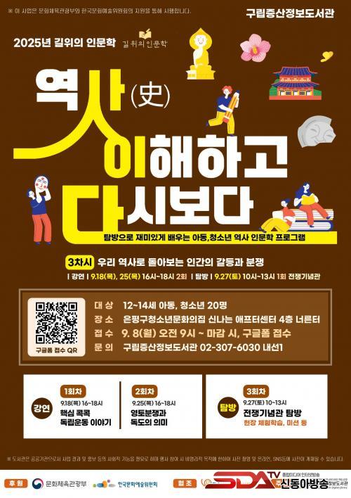 ÇÁ·Î±×·¥Àº ¹®ÈüÀ°°ü±¤ºÎ¿Í Çѱ¹µµ¼°üÇùȸ°¡ ÁÖÃÖÇÏ´Â ¡®2025³â ±æ À§ÀÇ Àι®ÇС¯ »ç¾÷ÀÇ ÀÏȯÀÌ´Ù. À̹ø 3Â÷½Ã ÇÁ·Î±×·¥Àº ¡®¿ì¸® ¿ª»ç·Î µ¹¾Æº¸´Â Àΰ£ÀÇ °¥µî°ú ºÐÀÀ» ÁÖÁ¦·Î ¿À´Â 18Àϰú 25ÀÏ¿¡´Â ÀºÆò±¸Ã»¼Ò³â¹®ÈÀÇÁý ½Å³ª´Â¾ÖÇÁÅͼ¾ÅÍ¿¡¼ °¿¬ÀÌ ¿¸®¸ç, ¿À´Â 27ÀÏ¿¡´Â ÀüÀï±â³ä°ü ÇöÀå Ž¹æÀ¸·Î ÁøÇàµÈ´Ù.