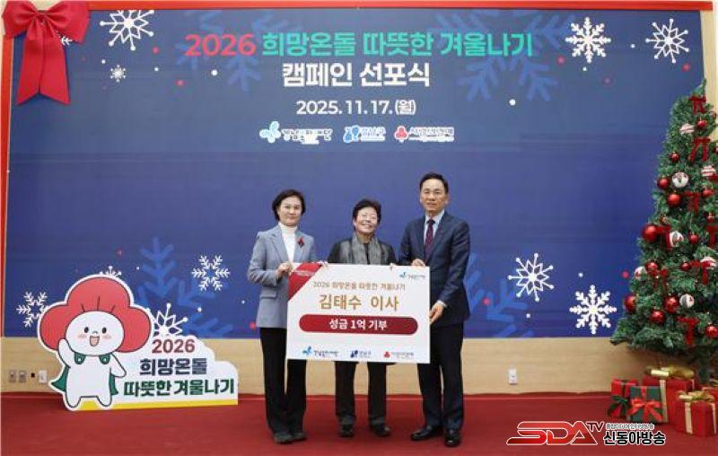 ¡®2026 Èñ¸Á¿Âµ¹ µû¶æÇÑ °Ü¿ï³ª±â¡¯ Ä·ÆäÀÎ ¼±Æ÷½Ä¿¡¼­ ±èżö °­³²º¹ÁöÀç´Ü ÀÌ»ç(°¡¿îµ¥)°¡ 1¾ï ¿øÀ» ±âºÎÇÑ ÈÄ, Á¶¼º¸í °­³²±¸Ã»Àå(¿À¸¥ÂÊ), ½ÅÇý¿µ ¼­¿ï»çȸº¹Áö°øµ¿¸ð±Ýȸ »ç¹«Ã³Àå(¿ÞÂÊ)°ú ±â³ä»çÁøÀ» ÃÔ¿µÇϰí ÀÖ´Ù.