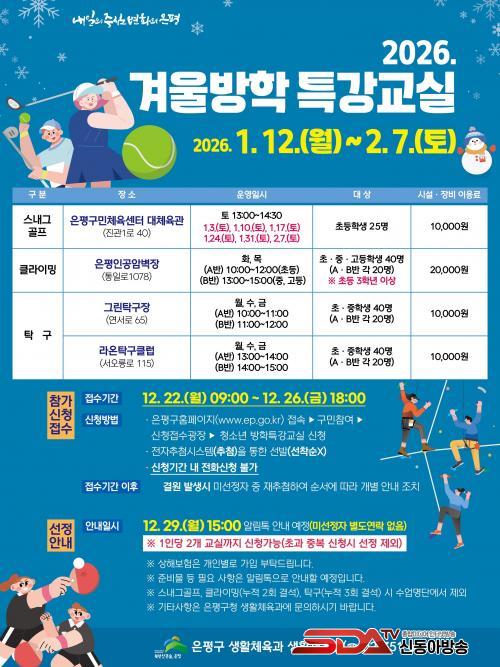 À̹ø »ýȰüÀ° Ư°±³½ÇÀº ¿À´Â 2026³â 1¿ù 12ÀϺÎÅÍ 2¿ù 6ÀϱîÁö ¿î¿µµÇ¸ç, ¡ã½º³»±×°ñÇÁ ¡ãŬ¶óÀÌ¹Ö ¡ãʱ¸ µî ÃÑ 3°³ Á¾¸ñ 4°³ ±³½Ç·Î ±¸¼ºµÆ´Ù. ¼ö°»ýµéÀº Àü¹® ÁöµµÀÚÀÇ °½À¿¡ µû¶ó ±âÃʺÎÅÍ Ã¼°èÀûÀ¸·Î ¹è¿ì°Ô µÈ´Ù.