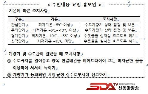 ¶ÇÇÑ ¡°±â¿ÂÀÌ ±Þ°ÝÈ÷ ¶³¾îÁú ¶§´Â °è·®±âÇÔ ³»ºÎ º¸¿Â»óŸ¦ Á¡°ËÇϰí, Àå±â°£ ¿ÜÃ⠽ÿ¡´Â ¼öµµ²ÀÁö¸¦ Á¶±Ý ¿¾î ¹°ÀÌ È帣µµ·Ï ÇÏ´Â µî µ¿ÆÄ ¿¹¹æ¿ä·ÉÀ» ½ÇÃµÇØ Áֽñ⠹ٶõ´Ù¡±¸ç, ¡°µ¿ÆÄ µî ºÒÆí »çÇ× ¹ß»ý ½Ã °üÇÒ ½Ã±º »ó¼öµµºÎ¼(¾ß°£ ´çÁ÷½Ç)·Î Áï½Ã ¿¬¶ôÇØ ´Þ¶ó¡±°í ´çºÎÇß´Ù.