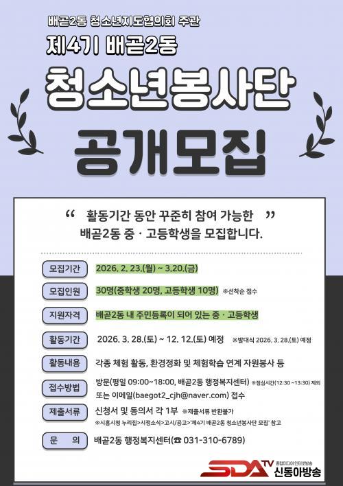 [½Åµ¿¾Æ¹æ¼Û ½ÃÈï½Ã=À̽ŵ¿±âÀÚ] ½ÃÈï½Ã ¹è°ð2µ¿ û¼Ò³âÁöµµÇùÀÇȸ´Â ÀÚ¿øºÀ»ç¿Í ´Ù¾çÇÑ Ã¼ÇèȰµ¿¿¡ Âü¿©ÇÒ Á¦4±â ¹è°ð2µ¿ û¼Ò³âºÀ»ç´Ü¿øÀ» ¸ðÁýÇÑ´Ù.