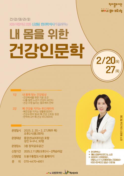 [½Åµ¿¾Æ¹æ¼Û µµºÀ±¸=À̽ŵ¿±âÀÚ] µµºÀ±¸ Çи¶À»µµ¼­°üÀÌ ¿À´Â 2¿ù 20Àϰú 27ÀÏ µÎ ¹ø¿¡ °ÉÃÄ ¡®³» ¸öÀ» À§ÇÑ °Ç°­Àι®ÇС¯ °­¿¬À» °³ÃÖÇÑ´Ù. °­¿¬¿¡´Â ½Å°æ¿ø¾à¼±¿¬±¸¼Ò ½Å°æ¿ø ¼ÒÀåÀÌ ³ª¼±´Ù. ½Å°æ¿ø ¼ÒÀåÀº ÇÑÀÇÇС¤¿µ¾çÇÐÀ» ±â¹ÝÀ¸·Î Çѹæ¾à¼±°ú ÀÚ¿¬°Ç°­ÇÐÀ» ¿¬±¸¡¦