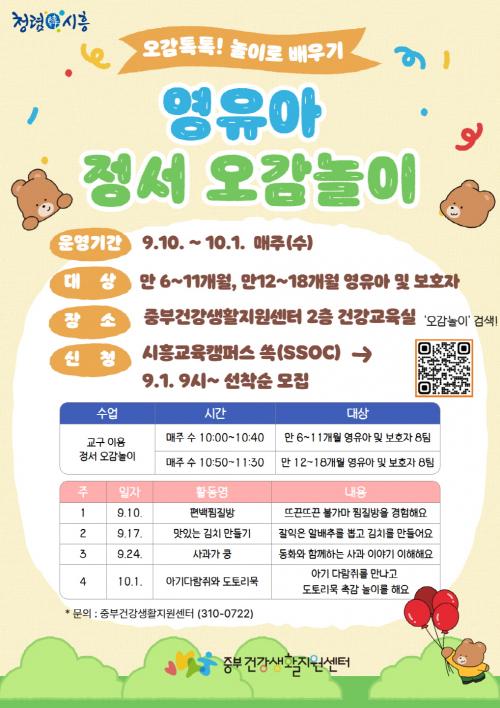 [½Åµ¿¾Æ¹æ¼Û ½ÃÈï½Ã=À̽ŵ¿±âÀÚ] ½ÃÈï½Ãº¸°Ç¼Ò Áߺΰǰ­»ýȰÁö¿ø¼¾ÅÍ(½ÃÀå ÀÓº´ÅÃ)´Â °ü³» ¿µÀ¯¾ÆÀÇ °Ç°­ÇÑ ¼ºÀå°ú ¹ß´ÞÀ» µ½±â À§ÇÑ ¡®¿À°¨ÅåÅå! ³îÀÌ·Î ¹è¿ì±â¡¯- ¿µÀ¯¾Æ Á¤¼­ ¿À°¨³îÀÌ ±³À°À» ¿À´Â 9¿ù 10ÀϺÎÅÍ 10¿ù 1ÀϱîÁö ¸ÅÁÖ ¼ö¿äÀÏ ÃÑ 4ȸ¿¡ °ÉÃÄ ¿î¿µÇÑ´Ù. ¡¦