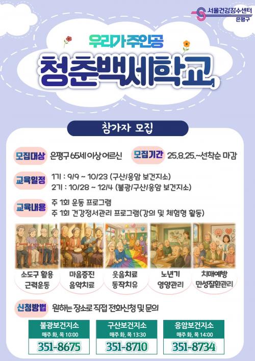[½Åµ¿¾Æ¹æ¼Û ÀºÆò±¸=À̽ŵ¿±âÀÚ] ¼­¿ï ÀºÆò±¸´Â ¼­¿ï°Ç°­Àå¼ö¼¾ÅÍ¿¡¼­ Áö¿ª ¾î¸£½ÅµéÀÇ °Ç°­ÇÑ ³ëÈÄ¿Í È°±âÂù »çȸÂü¿©¸¦ À§ÇØ ³»´ÞºÎÅÍ ÇϹݱ⠡®Ã»Ãá¹é¼¼Çб³¡®¸¦ °³°­Çϰí Âü°¡ÀÚ¸¦ ¸ðÁýÇÑ´Ù°í ¹àÇû´Ù. ¡¯Ã»Ãá¹é¼¼Çб³¡®´Â ¾î¸£½ÅÀÇ ½Åü¡¤ÀÎÁö ±â´É À¯Áö»Ó ¾Æ´Ï¶ó¡¦