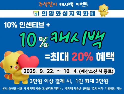 [½Åµ¿¾Æ¹æ¼Û=ÀÌÀçö±âÀÚ] È­¼ºÆ¯·Ê½Ã(½ÃÀå Á¤¸í±Ù)°¡ Ãß¼® ¸íÀýÀ» ¸Â¾Æ 9¿ù 22ÀϺÎÅÍ 10¿ù 4ÀϱîÁö ¡®Èñ¸ÁÈ­¼ºÁö¿ªÈ­Æó Ưº° ij½Ã¹é À̺¥Æ®¡¯¸¦ ¿î¿µÇÑ´Ù. À̹ø À̺¥Æ®´Â Çà»ç ±â°£ Áß Èñ¸ÁÈ­¼ºÁö¿ªÈ­Æó·Î 3¸¸ ¿ø ÀÌ»ó °áÁ¦ ½Ã °áÁ¦±Ý¾×ÀÇ 10%¸¦ ij½Ã¹éÀ¸·Î µ¹·ÁÁִ¡¦