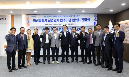 [½Åµ¿¾Æ¹æ¼Û=ÀÌÀçö±âÀÚ] È­¼ºÆ¯·Ê½Ã(½ÃÀå Á¤¸í±Ù)°¡ 25ÀÏ ½Ãû Áß¾ÓȸÀǽǿ¡¼­ ½Ã¿Í ±â¾÷ °£ÀÇ »ó»ý Çù·Â ¹æ¾È ³íÀǸ¦ À§ÇÑ ¡®»ê¾÷´ÜÁö ÀÔÁÖ±â¾÷ ÇùÀÇȸ °£´ãȸ¡¯¸¦ °³ÃÖÇß´Ù. À̳¯ °£´ãȸ´Â Á¤¸í±Ù È­¼ºÆ¯·Ê½ÃÀå ¹× À¯°ü ºÎ¼­, Àüº´¼± È­¼º»ê¾÷ÁøÈï¿øÀå, ÇѺ´È« È­¡¦