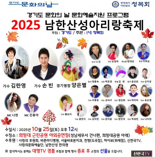 [½Åµ¿¾Æ¹æ¼Û±âÀÚ] °æ±âµµ°¡ ÁÖÃÖÇÏ°í »ç´Ü¹ýÀΠû¸ñȸ°¡ ÁÖ°üÇÏ´Â ¡®Á¦19ȸ ³²Çѻ꼺 ¾Æ¸®¶û ÃàÁ¦¡¯°¡ ¿À´Â 10¿ù 25ÀÏ(Åä) ¿ÀÈÄ 2½Ã, Èñ¸Á´ë ±Ù¸°°ø¿ø ¾ß¿Ü°ø¿¬Àå¿¡¼­ ¿­¸°´Ù. À̹ø Çà»ç´Â °æ±âµµ ¹®È­ÀÇ ³¯ ¹®È­¿¹¼úÁö¿øÇÁ·Î±×·¥ÀÇ ÀÏȯÀ¸·Î, û¸ñȸÀÇ µû¶æÇÑ ºÀ»çÁ¤½Å¡¦