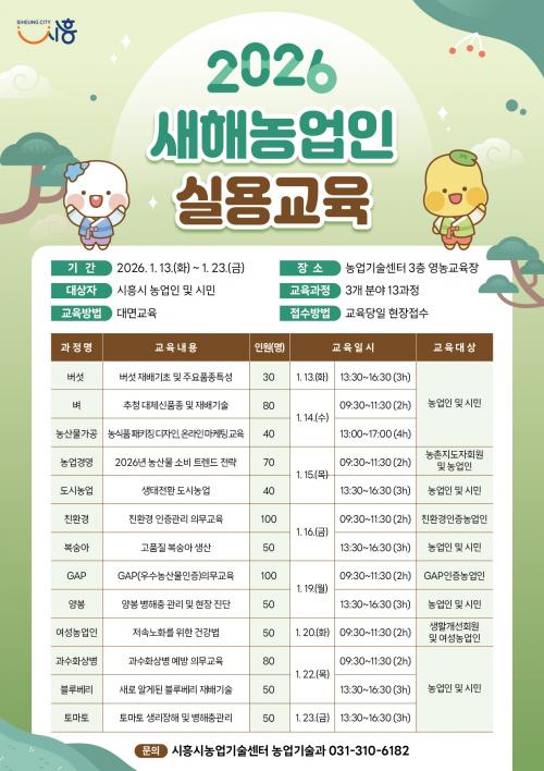 [½Åµ¿¾Æ¹æ¼Û ½ÃÈï½Ã=À̽ŵ¿±âÀÚ] ½ÃÈï½Ã´Â ³ó¾÷ÀÎÀÇ Àü¹®¿ª·® °­È­¿Í ¾ÈÁ¤ÀûÀÎ ¿µ³ó Ȱµ¿À» Áö¿øÇϱâ À§ÇØ ¡®2026³â »õÇØ³ó¾÷ÀÎ ½Ç¿ë±³À°¡¯À» ¿À´Â 1¿ù 13ÀϺÎÅÍ 23ÀϱîÁö ½ÃÈï½Ã³ó¾÷±â¼ú¼¾ÅÍ 3Ãþ ¿µ³ó±³À°Àå¿¡¼­ ¿î¿µÇÑ´Ù. ³ó¾÷ÀÎ 970¿© ¸íÀ» ´ë»óÀ¸·Î ÁøÇàµÇ´Â À̹ø¡¦
