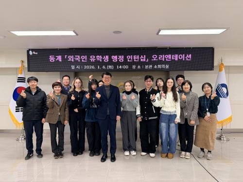 [½Åµ¿¾Æ¹æ¼Û °æ³²±èÇØ=³²±Ã¿µ±â±âÀÚ] ±èÇØ½Ã´Â 6ÀÏ ¿ÀÈÄ 2½Ã ½Ãû ¼ÒȸÀǽǿ¡¼­ ¿Ü±¹ÀÎ À¯Çлý ÇàÁ¤ ÀÎÅÏ½Ê ÀÓ¸í½Ä°ú ¿À¸®¿£Å×À̼ÇÀ» °³ÃÖÇß´Ù. À̹ø µ¿°è ÀÎÅϽÊÀº ÀÎÁ¦´ëÇб³ ±Û·ÎÄôëÇÐ »ç¾÷ÀÇ ÀÏȯÀ¸·Î ÃßÁøµÇ¸ç, ¼±¹ßµÈ À¯Çлý 5¸íÀº ¿À´Â 12ÀϺÎÅÍ 2¿ù 9ÀϱîÁö¡¦
