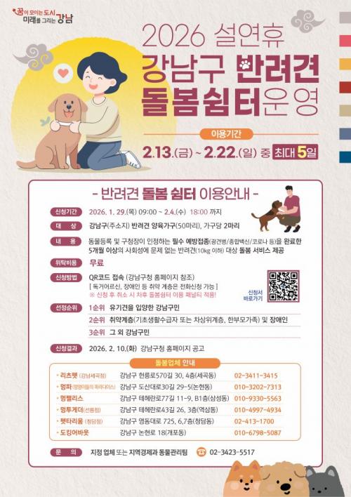 [½Åµ¿¾Æ¹æ¼Û °­³²±¸=À̽ŵ¿±âÀÚ] ²ÞÀÌ ¸ðÀÌ´Â µµ½Ã, ¹Ì·¡¸¦ ±×¸®´Â °­³²±¸°¡ ¼³ ¿¬ÈÞ ±â°£ ¾È½ÉÇÏ°í ¹Ý·Á°ßÀ» ¸Ã±æ ¼ö ÀÖ´Â ¡®¹Ý·Á°ß µ¹º½ ½°ÅÍ¡¯¸¦ ¿î¿µÇÑ´Ù. Á¢¼ö´Â 1¿ù 29ÀϺÎÅÍ 2¿ù 4ÀϱîÁö ÁøÇàÇϸç, ¼±Á¤µÈ ¹Ý·Á°ßÀº 2¿ù 13ÀϺÎÅÍ 22ÀÏ »çÀÌ ÃÖ´ë 5Àϰ£ ¹«·á·Î µ¹¡¦