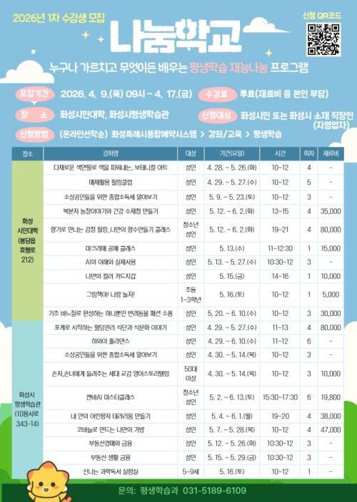 [½Åµ¿¾Æ¹æ¼Û=ÀÌÀçö±âÀÚ] È­¼ºÆ¯·Ê½Ã´Â ½Ã¹Î °£ Áö½Ä°ú Àç´ÉÀ» ³ª´©´Â Æò»ýÇнÀ ÇÁ·Î±×·¥ ¡®³ª´®Çб³¡¯ÀÇ 2026³â 1Â÷ ¼ö°­»ýÀ» ¿À´Â 4¿ù 9ÀϺÎÅÍ 4¿ù 17ÀϱîÁö ¼±Âø¼øÀ¸·Î ¸ðÁýÇÑ´Ù. ¡®³ª´®Çб³¡¯´Â ½Ã¹ÎÀÌ °¡Áø ´Ù¾çÇÑ Áö½Ä°ú Àç´É, ±â¼úÀ» ¼­·Î ³ª´©°í ¹è¿ì´Â Àç´É¡¦