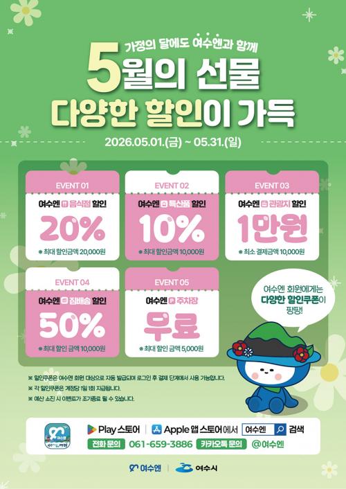 [½Åµ¿¾Æ¹æ¼Û ¿©¼ö=±è±â³² ±âÀÚ] ¿©¼ö½Ã(½ÃÀå Á¤±â¸í)´Â 5¿ù °¡Á¤ÀÇ ´ÞÀ» ¸Â¾Æ ½º¸¶Æ®°ü±¤ ÅëÇÕÇ÷§Æû ¡®¿©¼ö¿£¡¯À» ÅëÇØ ÇÒÀÎ ÇÁ·Î¸ð¼Ç°ú °ÅºÏ¼±ÃàÁ¦ ¿¬°è À̺¥Æ®¸¦ ¿î¿µÇÑ´Ù°í ¹àÇû´Ù. ¡®2026 °¡Á¤ÀÇ ´Þ ¸ÂÀÌ ¿©¼ö¿£ ÇÁ·Î¸ð¼Ç¡¯Àº 5¿ù 1ÀϺÎÅÍ 31ÀϱîÁö ÇÑ ´Þ°£ Áø¡¦