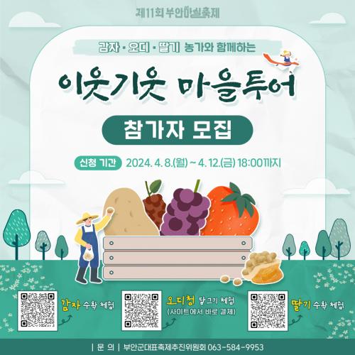 ÀÌ¿ô±â¿ô ¸¶À»Åõ¾î´Â ºÎ¾È±º °ü³» 3°³ À¾¸é(µ¿Áø¸é, Çà¾È¸é, º¸¾È¸é)¿¡ À§Ä¡ÇÑ ³ó°¡¿¡¼ Á÷Á¢ Ư»ê¹°µéÀ» ¼öÈ® ¶Ç´Â üÇèÇÒ ¼ö ÀÖ´Â ÇÁ·Î±×·¥À¸·Î, °¨ÀÚ ¼öÈ® üÇè, µþ±â ¼öÈ® üÇè, ¿Àµðû ´ã±×±â üÇèÀÌ °¢°¢ ÁøÇàµÈ´Ù.