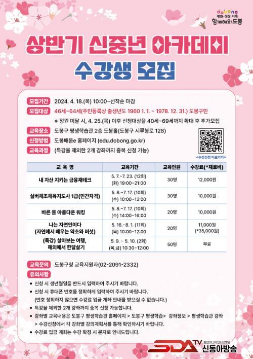 °ÁµéÀº ¿À´Â 5¿ùºÎÅÍ 10ÁÖ~12ÁÖ °úÁ¤À¸·Î ¿î¿µµÈ´Ù. ½Åû‧Á¢¼ö´Â 4¿ù 18ÀϺÎÅÍ ½ÃÀÛÇÏ¸ç ¼±Âø¼øÀ¸·Î ¸ðÁýÇÑ´Ù. µµºÀ±¸¿¡ ÁÖ¼ÒÁö¸¦ µÐ 46¼¼~64¼¼ ÁÖ¹ÎÀ̶ó¸é ´©±¸³ª ½Åû °¡´ÉÇÏ´Ù. ½ÅûÀº µµºÀ¹è¿òe´©¸®Áý¿¡¼ °¡´ÉÇÏ´Ù. ±³À°±â°£ µî ÀÚ¼¼ÇÑ »çÇ×Àº µµºÀ±¸ ±³À°Áö¿ø°ú(02-2091-2332)·Î ¹®ÀÇÇÏ¸é µÈ´Ù.