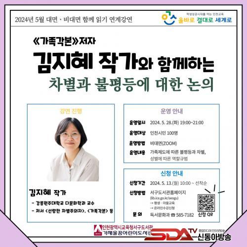 ÀÎõ±¤¿ª½Ã±³À°Ã»¼±¸µµ¼°ü(°üÀå ¹ÚÁ¤Èñ)Àº 5¿ù ¡¸´ë¸é¡¤ºñ´ë¸é ÇÔ²² Àб⡹ ¿¬°è °¿¬À¸·Î ¡®°¡Á·°¢º»¡¯ ±èÁöÇý ÀúÀÚ °¿¬À» 28ÀÏ ¿î¿µÇÑ´Ù.