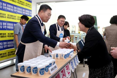 ȸÀÇ¿¡ ¾Õ¼ ¡®±º¼ö°¡ ÀüÇϴ û·Å ¼ÒÅë Ä¿ÇÇ¡¯ ³ª´® Çà»ç¸¦ ¿¾î ±è»ê ±º¼ö°¡ Á÷¿øµé¿¡°Ô Á÷Á¢ ´Ù¾çÇÑ Ã»·Å¸Þ½ÃÁö°¡ ´ã±ä û·Å ¼ÒÅë Ä¿ÇÇ¿Í °£½ÄÀ» ³ª´²ÁÖ¸ç Á÷¿øµéÀ» °Ý·ÁÇϰí û·ÅÀÇ Àǹ̸¦ ÇÔ²² ´ÙÁ³´Ù.
