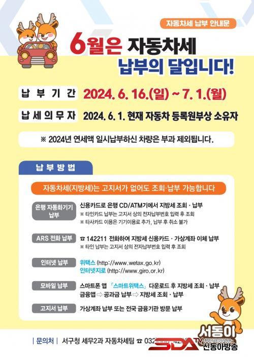 ³³ºÎ ±âÇÑÀº 7¿ù 1ÀϱîÁöÀÌ´Ù. ÀÚµ¿Â÷¼¼ ³³ºÎ´Â °íÁö¼­°¡ ¾øÀ̵µ °¡´ÉÇÏ´Ù. Àü±¹ ±ÝÀ¶±â°ü ¹æ¹® CD/ATM(Çö±ÝÀÚµ¿ÀÔÃâ±â) Á¶È¸ ³³ºÎ, ARS(¢Ï142211) ÀüÈ­ ³³ºÎ, ÀÎÅͳݻçÀÌÆ® À§Åýº(www.wetax.go.kr), ÀÎÅͳÝÁö·Î(www.giro.or.kr)¿¡¼­ Á¶È¸ ³³ºÎ, ½º¸¶Æ®À§Åýº(¾Û)¸¦ ÅëÇÑ ¸ð¹ÙÀϳ³ºÎ°¡ °¡´ÉÇÏ´Ù. ŸÀÎÄ«µå·Î ³³ºÎÇÒ °æ¿ì °íÁö¼­¿¡ ±âÀçµÈ ÀüÀÚ³³ºÎ¹øÈ£¸¦ Á¶È¸ÇØ ³³ºÎÇÏ¸é µÈ´Ù.