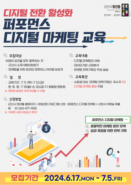 [½Åµ¿¾Æ¹æ¼Û=À̺´½Ä±âÀÚ] ±º»ê½Ã û³â¶ã â¾÷¼¾ÅͰ¡ 6¿ù 17ÀϺÎÅÍ 7¿ù 5ÀϱîÁö Áö¿ª (¿¹ºñ) â¾÷°¡µéÀÇ µðÁöÅÐ ¸¶ÄÉÆÃ ¿ª·® °­È­¸¦ À§ÇØ ÁøÇàÇÏ´Â ¡¸ÆÛÆ÷¸Õ½º µðÁöÅÐ ¸¶ÄÉÆÃ ±³À°¡¹ÀÇ Âü¿©ÀÚ¸¦ ¸ðÁýÇÑ´Ù.