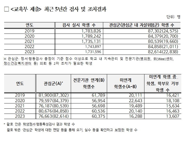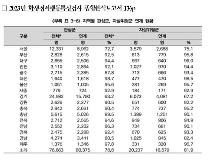 ±¹È¸ ±³À°À§¿øÈ¸ ¹é½Â¾Æ ÀÇ¿ø(´õºÒ¾î¹ÎÁÖ´ç)ÀÌ °ø°³ÇÑ ÀÚ·á¿¡ µû¸£¸é 2023³â ÇлýÁ¤¼­・Çൿ°Ë»ç °á°ú ÀÚ»ìÀ§Ç豺 Çлý 22,838¸íÀ» Æ÷ÇÔÇÑ °ü½É±º Çлý 82,614¸í Áß 16,288¸í(19.7%)Àº Àü¹®±â°ü ¿¬°è Ä¡·á¸¦ ¸ø ¹Þ¾ÒÀ¸¸ç, ÀÌ Áß 13,607¸í(83.5%)Àº Çлý¡¤Çкθ𰡠ġ·á¸¦ °ÅºÎÇÑ °ÍÀ¸·Î Á¶»çµÆ´Ù. ÇÑÆí °ü½É±º°ú ÀÚ»ìÀ§Ç豺 ºñÀ²ÀÌ ÃÊÁß°í Çлý Áß ÁßÇлý 1Çг⠺ñÀ²ÀÌ °¡Àå ³ôÀº °ÍÀ¸·Î ºÐ¼®µÆ´Ù.