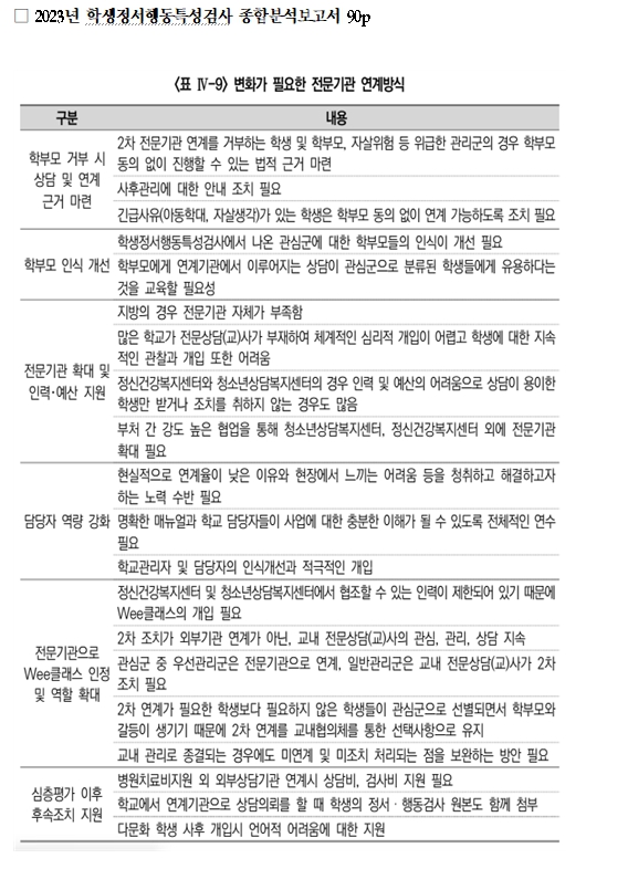 ¾÷¹«´ã´çÀÚ ¼³¹®Á¶»ç °á°ú ÀÀ´äÀÚ 95.1%°¡ Àü¹®±â°ü°úÀÇ ¿¬°è¿¡ ¾î·Á¿òÀÌ ÀÖ´Ù°í ÀÀ´äÇßÀ¸¸ç, ÇкθðÀÇ ¿¬°è °ÅºÎ(91.4%)°¡ °¡Àå Å« ¾î·Á¿òÀ̶ó°í ÀÀ´äÇß´Ù. À̵éÀº Àü¹®±â°ü ¿¬°è¹æ½Ä¿¡ ´ëÇÑ °³¼±Á¡À¸·Î ¡®Çкθð °ÅºÎ ½Ã »ó´ã ¹× ¿¬°è ±Ù°Å ¸¶·Ã¡¯, ¡®ÇкθðÀÇ ÀÎ½Ä °³¼±¡¯, ¡®Àü¹®±â°ü ºÎÁ·¿¡ µû¸¥ 2Â÷ ±â°ü ´Ù¾çÈ­ ¹× Àü¹®±â°ü ÀηÂ・¿¹»ê Áö¿ø¡¯, ¡®Ã¼°èÀûÀÎ ¿î¿µ ½Ã½ºÅÛ ±¸Ãà ¹× ´ã´çÀÚ ¿ª·® °­È­¡¯, ¡®Àü¹®±â°üÀ¸·Î WeeŬ·¡½º ÀÎÁ¤ ¹× ¿ªÇÒ È®´ë¡¯, ¡®½ÉÃþÆò°¡ ÀÌÈÄ ÈÄ¼Ó Á¶Ä¡ Áö¿ø¡¯ µîÀ» Á¦¾ÈÇß´Ù.