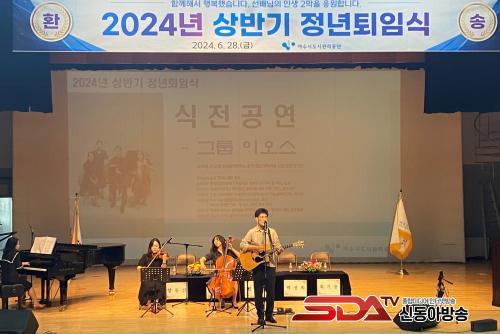½ÄÀü°ø¿¬À¸·Î´Â ±×·ì 'ÀÌ¿À½º'°¡ °¨¼ºÀûÀÎ À½¾ÇÀ» ¼±º¸¿© Âü¼®ÀÚµéÀÇ Å« È£ÀÀÀ» ¾ò¾ú´Ù. À̾îÁø ÅðÀÓÁ÷¿ø ¼Ò°³¿¡¼´Â µµ½Ã¹ÌȺÎÀÇ ¾çµ¿½Å, ±è¼¼µ¿, ±èº´·Î, ¹ÚÀåÈñ, ÃÖ±â¿ë ¾¾°¡ ¹«´ë¿¡ ¿Ã¶ó, °¢ÀÚÀÇ °ø·Î¿Í Çå½ÅÀ» ±â¸®´Â ½Ã°£ÀÌ ¸¶·ÃµÇ¾ú´Ù.