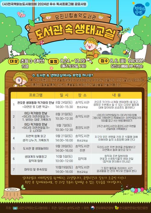 »ýű³½ÇÀº ¾ÆÀ̵éÀÌ ¿ì¸® °íÀå ÀÚ¿¬ ÀÚ¿øÀ» ¼ÒÁßÈ÷ ¿©±â°í, ȯ°æ ÀǽÄÀ» °¡Áú ¼ö ÀÖµµ·Ï ±¸¼ºÇß´Ù. ¡â<»ç°èÀý »ýÅÂÄ·ÇÎ>ÀÇ ±Ç¿ÀÁØ ÀÛ°¡ ¡â<ÀÌ´ÙÀÇ ÀÚ¿¬°üÂûÀϱâ>ÀÇ ÀÌ´Ù ÀÛ°¡¿ÍÀÇ ¸¸³² µî À¯¸íÀÛ°¡¿ÍÀÇ ¸¸³²) ¡âÀÚ¿¬Ã¥ ÇÔ²² Àб⠡⵵¼°ü ¿· »ýųîÀÌÅÍ ¡â»ýŰèÀÇ º¸¹°Ã¢°í ÇÕ´öÁ¦ Ž¹æ µîÀÇ È°µ¿À» ÇÏ¸ç ±â·Ï¹°À» ÇÔ²² Á¤¸®ÇÏ°í °á°ú¹°(Ã¥)À» ¸¸µé¾î º¸´Â ÇÁ·Î±×·¥ÀÌ´Ù. 8¿ù 24ÀϺÎÅÍ 10¿ù±îÁö ÃÑ 7ȸ ¿î¿µÇÑ´Ù.