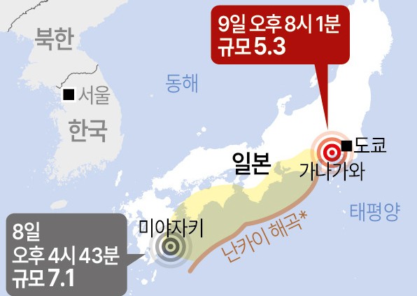 [½Åµ¿¾Æ¹æ¼Û=Á¶µµÈ¯ ±âÀÚ] Áö³ 8ÀÏ ÀϺ» ³²ºÎ ¹Ì¾ßÀÚŰÇö¿¡¼ ±Ô¸ð 7.1 ÁöÁø ¹ß»ý ÇϷ縸¿¡ µµÄì Àα٠°¡³ª°¡¿ÍÇö¿¡¼ ±Ô¸ð 5.3, ´ÙÀ½³¯ ȪīÀ̵µ ºÏ¹æ¿¡¼ 6.8 ÁöÁøÀÌ ¹ß»ýÇÏ´Â µî »çÈê ¿¬¼Ó ÁöÁø¿¡ ÀϺ»ÀÌ ¶³°í ÀÖ´Ù.