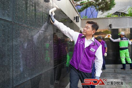 À̳¯ ÀÌÇÊÇü ±¸Ã»ÀåÀº ȯ°æ¹ÌÈ¿ø 20¿© ¸í°ú ÇÔ²² ÂüÀüÀ¯°øÀÚ ¼º¸í ¹× °øÀû³»¿ëÀÌ °¢ÀÎµÈ ¸íºñ¿Í °è´ÜÀ» ¹°·Î ±ú²ýÀÌ Ã»¼ÒÇϰí ÁÖº¯ ÀâÃʵµ Á¦°ÅÇß´Ù. ÃæÈ¥ÀÇ º®¿¡ ³»·Á¾ÉÀº ¸ÕÁö¿Í ¹°±â¸¦ ¼ö°ÇÀ¸·Î ±ú²ýÇÏ°Ô ´Û¾Æ³½ ÈÄ, ¼ø±¹¼±¿°ú È£±¹¿µ·É¿¡ ´ëÇÑ ¹¬³ä°ú ÇåÈ·Î Çà»ç´Â ¸¶¹«¸®µÆ´Ù.
