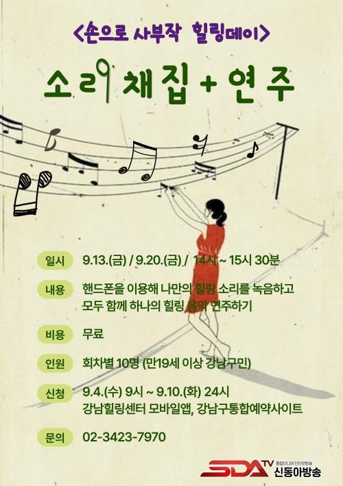 ¼Ò¸® äÁý ÇÁ·Î±×·¥Àº ³ª¸¸ÀÇ Èú¸µ ¼Ò¸®¸¦ ÇÚµåÆù¿¡ ³ìÀ½Çϰí, Âü°¡ÀÚµéÀÌ Ã¤ÁýÇÑ ¼Ò¸®¸¦ ¸ð¾Æ ÇϳªÀÇ À½¾ÇÀ¸·Î ¸¸µå´Â ÀÌ»ö °Á´Ù. Çѱ¹´ëÁßÀ½¾Ç»ó ÀçÁî&Å©·Î½º¿À¹ö ºÎ¹®À» ¼ö»óÇÏ°í ´º¿å OMI±¹Á¦¾ÆÆ®¼¾ÅÍ ·¹Áö´ø½Ã ¾ÆÆ¼½ºÆ®·Î ¼±Á¤µÅ ¼¿ï½Ã¸³¹Ì¼ú°ü µî¿¡¼ ´Ù¾çÇÑ ÇÁ·Î±×·¥À» ¿î¿µÇÑ Áö¹Ú ÀÛ°¡¸¦ ¼·¿ÜÇß´Ù. ¼ö¾÷Àº °³Æ÷Á¡(»ï¼º·Î 3±æ 39)¿¡¼ 9¿ù 13ÀÏ, 20ÀÏ 14½Ã~15½Ã 30ºÐ¿¡ ÁøÇàÇÑ´Ù.