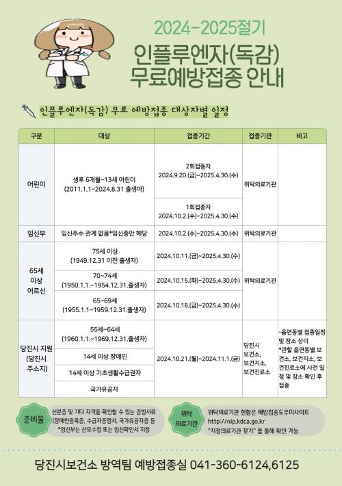 ¶ÇÇÑ ´çÁø½Ã´Â ÀÚü »ç¾÷À¸·Î 55~64¼¼ ´çÁø½Ã¹Î(1960.1.1.~1969.12.31. Ãâ»ýÀÚ), 14¼¼ ÀÌ»ó ±âÃÊ»ýȰ¼ö±ÞÀÚ, Àå¾ÖÀÎ, ±¹°¡À¯°øÀÚ ´ë»ó ¹«·á ¿¹¹æÁ¢Á¾À» 10¿ù 21ÀϺÎÅÍ ´çÁø½Ã º¸°Ç¼Ò, º¸°ÇÁö¼Ò, º¸°ÇÁø·á¼Ò¿¡¼ ½Ç½ÃÇÑ´Ù. ´ë»óÀÚ´Â ½ÅºÐÁõ ¹× ±âÃÊ»ýȰ¼ö±Þ¡¤±¹°¡À¯°øÀÚ¡¤Àå¾ÖÀÎ µî·ÏÁõ µî È®ÀÎ ¼·ù¸¦ Á¦½ÃÇØ¾ß ÇÑ´Ù. ¸¶À»º° Á¢Á¾±â°ü(º¸°Ç±â°ü) ¹× ÀÏÁ¤ÀÌ Á¤ÇØÁ® ÀÖÀ¸¹Ç·Î ¹Ýµå½Ã »çÀü È®ÀÎ ÈÄ Á¢Á¾ÇØ¾ß Çϸç, ¹é½Å ¼ö±Þ »óȲ µî¿¡ µû¶ó Á¢Á¾Àº Á¶±â ¸¶°¨µÉ ¼ö ÀÖ´Ù.