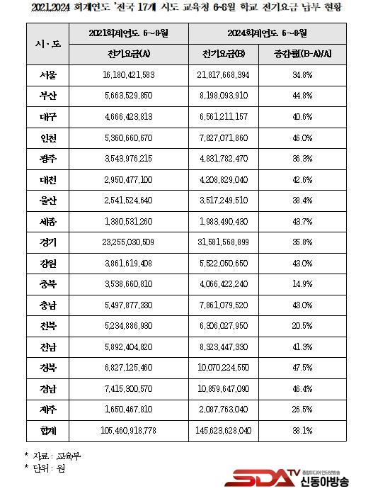 ±¹È¸ ±³À°À§¿øÈ¸ ¹é½Â¾Æ ÀÇ¿ø(´õºÒ¾î¹ÎÁÖ´ç)ÀÌ °ø°³ÇÑ ¡®Àü±¹ 17°³ ½Ãµµ ±³À°Ã» 6~8¿ù Çб³ Àü±â¿ä±Ý ÇöȲ¡¯¿¡ µû¸£¸é ¿ÃÇØ 6~8¿ù ³³ºÎ ±Ý¾×Àº 1,456¾ï ¿øÀÌ´Ù. Àü±â¿ä±ÝÀÌ ÀλóµÇ±â ÀüÀÎ 2021³â 6~8¿ù ³³ºÎ Àü±â¿ä±Ý 1,054¾ï ¿øº¸´Ù 402¾ï ¿ø(38.1%) ÆøµîÇß´Ù. 6~8¿ù Çб³ Àü±â¿ä±ÝÀº °ø¡¤»ç¸³ À¯¡¤ÃÊ¡¤Áß¡¤°í¡¤Æ¯¼öÇб³°¡ ³³ºÎÇÑ Àü±â¿ä±ÝÀ¸·Î ½ÇÁ¦ »ç¿ëÇÑ ´ÞÀº 5~7¿ùÀÌ´Ù.