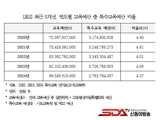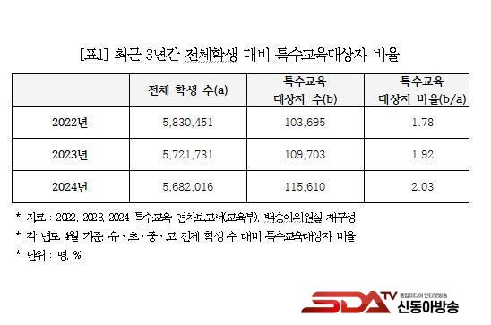 ±¹È¸ ±³À°À§¿øÈ¸ ¹é½Â¾Æ ÀÇ¿ø(´õºÒ¾î¹ÎÁÖ´ç)°ú ±³»ç³ëµ¿Á¶ÇÕ¿¬¸Í(±è¿ë¼­ À§¿øÀå)ÀÌ ±¹Á¤°¨»ç ÀÚ·á ¡®2022~2024³â Ư¼ö±³À° ¿¬Â÷º¸°í¼­¡¯¸¦ ºÐ¼®ÇÑ °á°ú, Àüü ÇлýÀº 2022³â 583¸¸ 451¸í, 2023³â 572¸¸ 1,731¸í, 2024³â 568¸¸ 2,016¸íÀ¸·Î °è¼Ó °¨¼ÒÇϰí ÀÖ¾ú´Ù. ¹Ý¸é¿¡ Ư¼ö±³À° ´ë»óÀÚ´Â 2022³â 10¸¸ 3,695¸í(1.78%), 2023³â 10¸¸ 9,703¸í(1.92%), 2024³â 4¿ù ±âÁØ 11¸¸ 5,610¸í(2.03%)À¸·Î ¸Å³â Áõ°¡ Ãß¼¼¿´´Ù. 2020³â 9¸¸ 5,420¸í, 2021³â 9¸¸ 8,154¸íÀ̾ú°í, 5³â »õ Çлý Áõ°¡À²ÀÌ 21.2%¿¡ ´ÞÇß´Ù.
