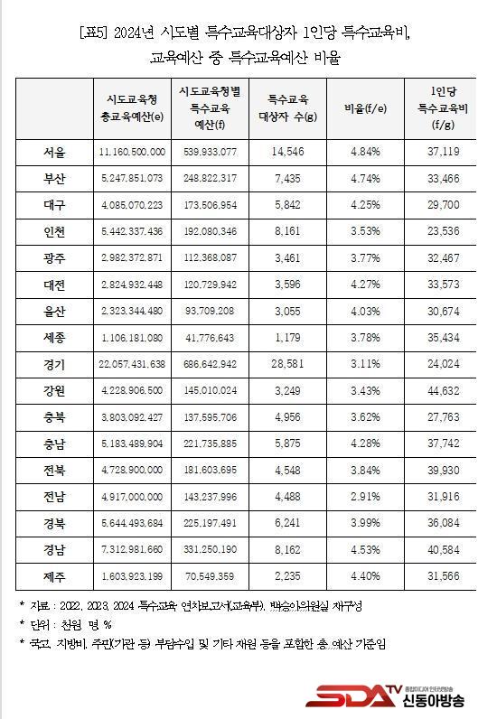 Ư¼ö±³À° ¿¹»êÀº Áö¿ªº°·Îµµ Å« °ÝÂ÷¸¦ º¸¿´´Ù. Ư¼ö±³À°´ë»óÀÚ 1ÀÎ´ç ±³À°ºñ°¡ ¸¹Àº Áö¿ªÀº °­¿ø 4,463¸¸¿ø, °æ³² 4.058¸¸¿øÀ̰í, ÀûÀº Áö¿ªÀº ÀÎõ 2,353¸¸¿ø, °æ±â 2,402¸¸¿ø ¼øÀ̾ú´Ù. ¶ÇÇÑ ½Ãµµ±³À°Ã»º° Ãѱ³À°¿¹»ê Áß Æ¯¼ö±³À°¿¹»ê ºñÁßÀÌ Å« °÷Àº ¼­¿ï 4.84%, ºÎ»ê 4.73%, ÀÛÀº °÷Àº Àü³² 2.91%, °æ±â 3.11%·Î ³ªÅ¸³µ´Ù.