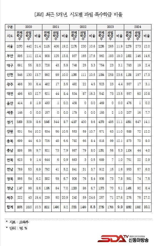 ÇÑÆí, °ú¹Ð Ư¼öÇÐ±Þ ¼öµµ ÇØ¸¶´Ù Áõ°¡ Ãß¼¼ÀÌ´Ù. °ú¹Ð Ư¼öÇÐ±Þ ¼ö´Â 2022³â 1,499ÇбÞ(8.8%), 2023³â 1,766ÇбÞ(9.9%), ±×¸®°í 2024³â 1,822ÇбÞ(10.1%)À¸·Î ²ÙÁØÈ÷ Áõ°¡ÇÏ¿´´Ù. ºñÀ²·Î´Â 2020³â(10.3%) ¼öÁØÀ¸·Î µ¹¾Æ°£ ¼ÀÀÌ´Ù. Áö¿ªº° °ú¹Ð Ư¼öÇÐ±Þ ºñÀ²Àº Á¦ÁÖ 27.2%, ÀÎõ 17.3%, ºÎ»ê 14.6%, °æ±â 14.1% ¼øÀ¸·Î ³ô¾Ò°í, ¿ï»ê 0.2%, ´ë±¸ 2.4%, ÀüºÏ 2.9%, ±¤ÁÖ 3.1% ¼øÀ¸·Î ³·¾Æ Áö¿ª °ÝÂ÷°¡ ½ÉÇß´Ù. ÇöÇà Æ¯¼ö±³À°¹ý»ó Ư¼öÇб޴ç Çлý ¼ö´Â ¡ãÀ¯Ä¡¿ø 4¸í ¡ãÃÊÁßÇб³ 6¸í ¡ã°íµîÇб³ 7¸íÀ̰í, À̸¦ ÃʰúÇÏ¸é °ú¹ÐÇбÞÀ¸·Î ºÐ·ùµÈ´Ù.