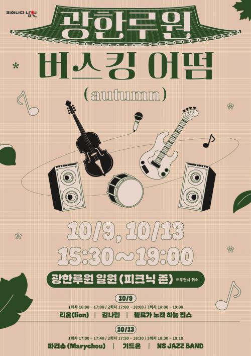 À̹ø Çà»ç´Â ±¤ÇÑ·ç¿ø ÇÇÅ©´Ð Çà»ç¿Í ¿¬°èµÇ¾î ¹æ¹®°´µé¿¡°Ô ¹®È¿Í ÀÚ¿¬À» µ¿½Ã¿¡ Áñ±æ ¼ö Àִ Ưº°ÇÑ ½Ã°£À» Á¦°øÇÏ¸ç ÆË, ÀçÁî, ½Ì¾î¼Û¶óÀÌÅÍ µî ´Ù¾çÇÑ À½¾Ç À帣ÀÇ ¾ÆÆ¼½ºÆ®µéÀÌ Âü¿©ÇØ °¡À»ÀÇ ³¶¸¸ÀûÀÎ ºÐÀ§±â ¼Ó¿¡¼ ´Ùä·Î¿î °ø¿¬À» ¼±º¸ÀÏ ¿¹Á¤ÀÌ´Ù.