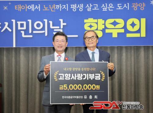 °íÇâ»ç¶û ±âºÎ±Ý Àü´Þ½Ä¿¡¼´Â ¡®2024 ÀÚ¶û½º·¯¿î ±¤¾çÀÎ »ó¡¯ ¼ö»óÀÚ·Î ¼±Á¤µÈ À¯ÃæÈñ Çѱ¹´ëÁßÀ½¾Ç¹Ú¹°°üÀåÀÌ Áö³ÇØ¿¡ À̾î 2³â ¿¬¼ÓÀ¸·Î °íÇâ»ç¶û±âºÎ±Ý ¿¬°£ ÃÖ°í¾×ÀÎ 500¸¸ ¿øÀ» Àü´ÞÇØ Âü¼®ÀÚµéÀÇ ¹Ú¼ö°¥Ã¤°¡ ½ñ¾ÆÁ³´Ù.
