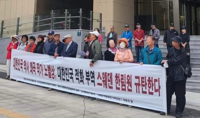 ÇØ´ç »çÁøÀº ½º¿þµ§ ´ë»ç°ü ¾Õ¿¡¼ ¡®´ëÇѹα¹ ¿ª»ç ¿Ö°î ÀÛ°¡ ³ëº§»ó, ´ëÇѹα¹ ÀûÈ ºÎ¿ª ½º¿þµ§ ÇѸ²¿ø ±ÔźÇÑ´Ù¡¯¶ó´Â Çѱ۷Π¾²¿©Áø Ç÷¡Ä«µå¸¦ µé°í ½ÃÀ§ÇÏ´Â ¸ð½ÀÀ¸·Î,