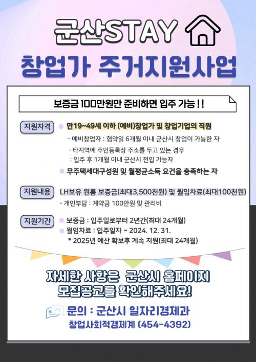 2020³âºÎÅÍ ½ÃÀÛÇÑ º» »ç¾÷À» ÅëÇØ 4³â°£ ÃÑ 40¸íÀÇ Ã¢¾÷°¡µéÀÌ ÀÔÁÖÇÏ¿´À¸¸ç, Áö¿ø ±â°£ Á¾·á ÀÌÈÄ¿¡µµ 80% Á¤µµ°¡ °è¼Ó °ÅÁÖÇÒ Á¤µµ·Î ¸¸Á·µµµµ ³ôÀº ÆíÀÌ´Ù. ÀÓ´ë ¿ø·ëÀº ³ª¿îµ¿, ¼ö¼Ûµ¿, Áö°îµ¿ µî 20¿© °³·Î ÀÔÁÖ °è¾à ü°á ½Ã ÀÔÁÖÀÚÀÇ ¼±È£µµ¸¦ ¹Ý¿µÇÏ¿© ¿ì¼±¼øÀ§¸¦ ¹èÁ¤ÇÑ´Ù.