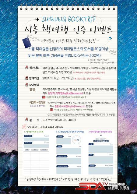 ¡®Ã¥ ¿©Çà ÀÎÁõ À̺¥Æ®¡¯ Âü¿©´Â ±â°£ ³»¿¡ Á¢¼öµÈ °Ç¿¡ ´ëÇØ¼¸¸ ÀÎÁ¤Çϸç, ±âŸ ÀÚ¼¼ÇÑ ³»¿ëÀº ½ÃÈï½Ã µµ¼°ü ´©¸®Áý(https://lib.siheung.go.kr)À» ÅëÇØ È®ÀÎÇÒ ¼ö ÀÖ´Ù. ±Ã±ÝÇÑ Á¡Àº ¼Ò·¡ºûµµ¼°ü(031-310-4082)À» ÅëÇØ ¹®ÀÇÇÏ¸é µÈ´Ù.