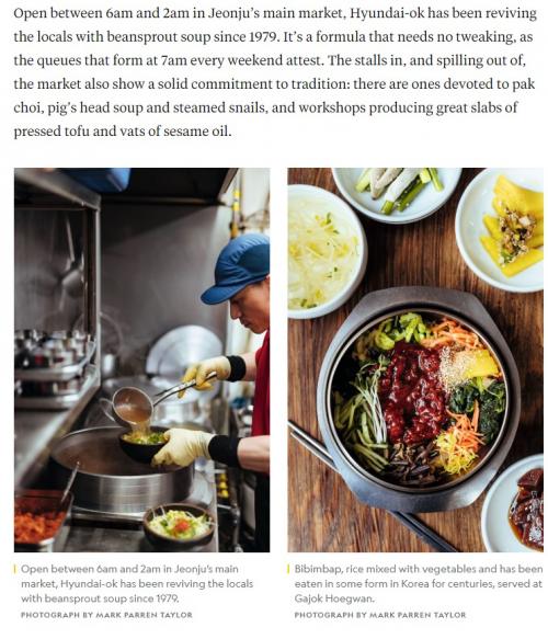 30ÀÏ ÀüÁֽÿ¡ µû¸£¸é ³»¼Å³ÎÁö¿À±×·¡ÇÈÀº ÃÖ±Ù ¡®Why Jeonju is the best place to eat in South Korea(ÀüÁÖ°¡ Çѱ¹ÀÇ ÃÖ°í ¹Ì½Äµµ½ÃÀÎ ÀÌÀ¯)¡¯¶ó´Â Á¦ÇÏÀÇ ±â»ç¸¦ ÅëÇØ ³²ºÎ½ÃÀåÀÇ Äᳪ¹°±¹¹ä, ºñºö¹ä, ¸·°É¸®, ÀüÅëÂ÷ µî ÀüÁÖÀÇ ´ëÇ¥ À½½Ä»Ó¸¸ ¾Æ´Ï¶ó ¿¹Çâ ÀüÁÖÀÇ ¹®È¡¤¿ª»çÀû Á¤Ã¼¼ºÀ» ¼Ò°³Çß´Ù.