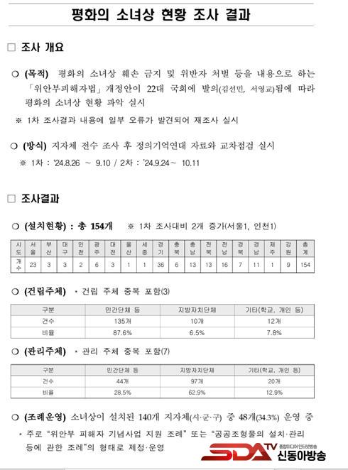 ¡à ±¹È¸ ¿©¼º°¡Á·À§¿øÈ¸ ¹é½Â¾Æ ÀÇ¿ø(´õºÒ¾î¹ÎÁÖ´ç)ÀÌ °ø°³ÇÑ ¿©¼º°¡Á·ºÎ ±¹Á¤°¨»ç ÀÚ·á¿¡ µû¸£¸é Àü±¹¿¡ ¼³Ä¡µÈ ¼Ò³à»óÀº 1Â÷ Á¶»ç¶§º¸´Ù 2°³ ¸¹Àº 154°³·Î ÃÖÁ¾ Áý°èµÆ´Ù. ¼¿ï 23°³, ºÎ»ê 3°³, ´ë±¸ 3°³, ÀÎõ 2°³, ±¤ÁÖ 6°³, ´ëÀü 3°³, ¿ï»ê 1°³, ¼¼Á¾ 1°³, °æ±â 36°³, ÃæºÏ 6°³, Ãæ³² 13°³, ÀüºÏ 13°³, Àü³² 16°³, °æºÏ 7°³, °æ³² 11°³, Á¦ÁÖ 1°³, °¿ø 9°³°¡ ¼³Ä¡µÆ´Ù.