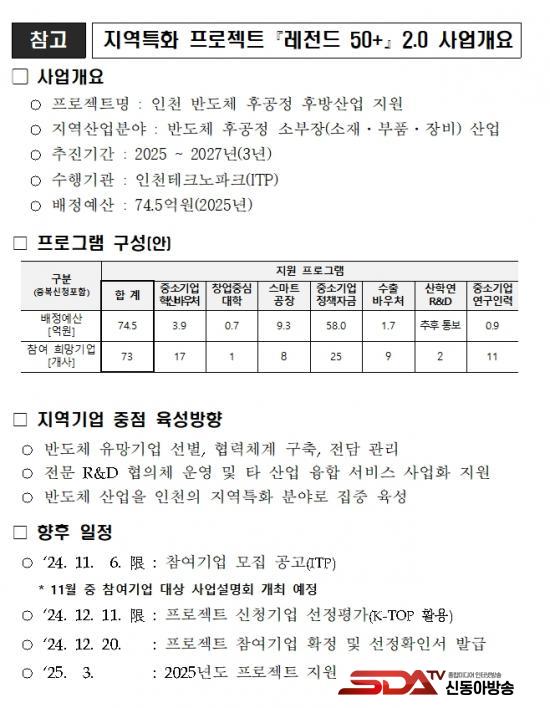 ¡®Áö¿ªÆ¯È ÇÁ·ÎÁ§Æ® ·¹Àüµå50+ 2.0¡¯ »ç¾÷Àº Áö¿ªÀÇ ÇÙ½É »ê¾÷À» À°¼ºÇϰí Áß¼Ò±â¾÷ÀÇ ¼ºÀå°ú Çõ½ÅÀ» ÃËÁøÇϱâ À§ÇÑ ´ë±Ô¸ð ÇÁ·ÎÁ§Æ®ÀÌ´Ù. ÀÎõ½Ã´Â ÀÌ »ç¾÷À» ÅëÇØ ¹ÝµµÃ¼ ÈİøÁ¤ ¼ÒÀ硤ºÎǰ¡¤Àåºñ(¼ÒºÎÀå) »ê¾÷À» Áö¿ªÆ¯È ºÐ¾ß·Î ÁýÁß À°¼ºÇÒ °èȹÀÌ´Ù.