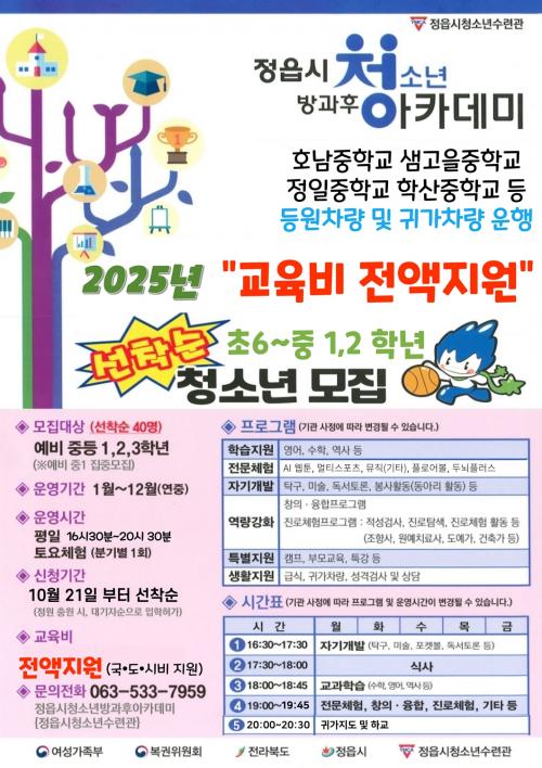½ÅÀÔ»ý ¸ðÁý ´ë»óÀº 2025³â ¿¹ºñ Áß1(ÇöÀç ÃʵîÇб³ 6Çгâ)ºÎÅÍ ÁßÇб³ 1, 2Çгâ ÇлýÀÌ´Ù. ¾ÆÄ«µ¥¹Ì¿¡¼­´Â ¸ÂÃãÇü ÇÁ·Î±×·¥À» ÅëÇØ ´Ù¾çÇÑ Ä£±¸µéÀÌ ÇÔ²² ¾î¿ï¸®¸ç ¼ºÀåÇÒ ¼ö ÀÖµµ·Ï µ½´Â´Ù. ÇлýµéÀÇ ¾ÈÀüÇÑ ÇнÀ ȯ°æÀ» À§ÇØ µî¿ø°ú ±Í°¡ Â÷·®ÀÌ Áö¿øµÇ¸ç, ¹«»ó±Þ½Ä°ú ÇÔ²² ÆòÀÏ ¿ÀÈÄ 4½Ã 30ºÐºÎÅÍ Àú³á 8½Ã 30ºÐ±îÁö ¿î¿µµÈ´Ù.