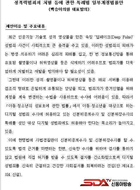 ¡à ±¹È¸ ¿©¼º°¡Á·À§¿øÈ¸ ¹é½Â¾Æ ÀÇ¿ø(´õºÒ¾î¹ÎÁÖ´ç)ÀÌ ´ëÇ¥¹ßÀÇÇÑ ¡¸¼ºÆø·Â¹üÁËÀÇ Ã³¹ú µî¿¡ °üÇÑ Æ¯·Ê¹ý °³Á¤¾È¡¹¿¡ µû¸£¸é µðÁöÅÐ ¼º¹üÁË »ç¹ý°æÂû°üÀÌ ½ÅºÐºñ°ø°³¼ö»ç ¹× ½ÅºÐÀ§Àå¼ö»ç¸¦ ÇÒ ¼ö ÀÖµµ·Ï ÇÏ°í ½Å¼ÓÇÑ ¼ö»ç¸¦ À§ÇÏ¿© °Ë»ç¸¦ ÅëÇÏÁö ¾Ê°í ¹ý¿ø¿¡ Á÷Á¢ Çã°¡¸¦ ¹ÞÀ» ¼ö ÀÖµµ·Ï ÀýÂ÷¸¦ °£¼ÒÈÇÏ´Â ³»¿ëÀÌ´Ù.