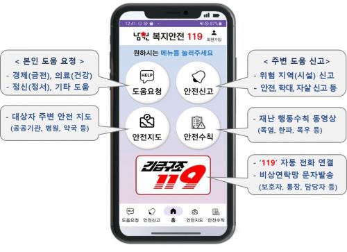 ¡¸³²¿ø º¹Áö¾ÈÀü 119¡¹ ¾ÛÀº ±ä±Þ±¸Á¶ 119, µµ¿ò ¿äû, ¾ÈÀü ½Å°í, ¾ÈÀü Áöµµ, ¾ÈÀü ¼öÄ¢ µî 5°¡Áö ÁÖ¿ä ±â´ÉÀ» žÀçÇÏ¿©, ½Ã¹ÎµéÀÌ ¾ðÁ¦ ¾îµð¼³ª ½Ã°£°ú Àå¼Ò¿¡ ±¸¾Ö¹ÞÁö ¾Ê°í µµ¿òÀ» ¿äûÇϰųª ½Å°íÇÒ ¼ö ÀÖ´Â ±â´ÉÀ» Áö¿øÇÑ´Ù.