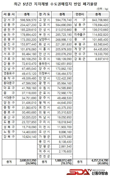 Áö¿ªº°·Î ºÃÀ» ¶§ ¼¿ï½Ã¿¡¼´Â °¼±¸(59¸¸8õ506t), ¼ºµ¿±¸(23¸¸4õ427t), ±Ýõ±¸(18¸¸5õ229t), ¼ÛÆÄ±¸(17¸¸8õ694t), ÀºÆò±¸(17¸¸8õ694t), ±¤Áø±¸(15¸¸3õ977t), °ü¾Ç±¸(10¸¸1õ676t) µî 7°³ ÀÚÄ¡±¸¿¡¼ 10¸¸t ³Ñ´Â Æó±â¹°À» ¼öµµ±Ç¸Å¸³Áö·Î º¸³Â´Ù.