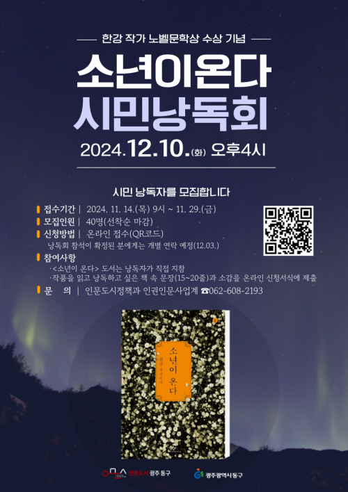 ¡®±¤ÁÖ µ¿±¸, 80³â ¿À¿ùÀÇ ¼Ò³âÀ» ¸¸³ª´Ù¡¯¸¦ ÁÖÁ¦·Î ¿¸®´Â À̹ø ³¶µ¶È¸ »çȸ´Â ¿¬±ØÀÎ ÁöÁ¤³² ¾¾°¡ ¸Ã´Â´Ù. Çà»ç¿¡´Â ½Ã¹Î, µ¶¼µ¿¾Æ¸®, Ã¥¹æ µî ´Ù¾çÇÑ µ¶¼°øµ¿Ã¼µéÀÌ ¸ð¿© ±¤ÁÖ 5¡¤18¹ÎÁÖȿÀ» ¼ÒÀç·Î ÇÑ ÀÛ°¡ÀÇ ÀÛǰ ¡®¼Ò³âÀÌ ¿Â´Ù¡¯ÀÇ ¹®ÀåµéÀ» ³¶µ¶Çϰí 5¡¤18¿¡ ¾ôÈù À̾߱âµéÀ» ³ª´ ¿¹Á¤ÀÌ´Ù.