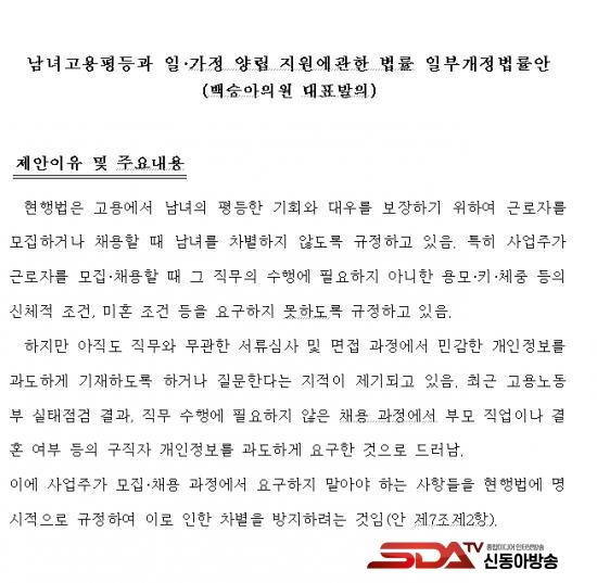 ¡à ±¹È¸ ±³À°À§¿øÈ¸¡¤¿©¼º°¡Á·À§¿øÈ¸ ¼Ò¼Ó ¹é½Â¾Æ ÀÇ¿ø(´õºÒ¾î¹ÎÁÖ´ç)ÀÌ ´ëÇ¥¹ßÀÇÇÑ ¡¸³²³à°í¿ëÆòµî°ú ÀÏ¡¤°¡Á¤ ¾ç¸³ Áö¿ø¿¡ °üÇÑ ¹ý·ü °³Á¤¾È¡¹Àº ¡ã¿ë¸ð¡¤Å°¡¤Ã¼Áß µîÀÇ ½ÅüÀû Á¶°Ç ¡ãÈ¥ÀÎ ¿©ºÎ¡¤Àӽš¤Ãâ»ê µî¿¡ °üÇÑ Á¶°Ç ¡ãÃâ½ÅÁö¿ª¡¤Àç»ê µî¿¡ °üÇÑ Á¶°Ç ¡ãÁ÷°èÁ¸ºñ¼Ó ¹× ÇüÁ¦ÀÚ¸ÅÀÇ Çз¡¤Á÷¾÷¡¤Àç»ê µî¿¡ °üÇÑ Á¶°Ç µî »ç¾÷ÁÖ°¡ ±Ù·ÎÀÚ Ã¤¿ë¡¤¸ðÁý °úÁ¤¿¡¼­ ¿ä±¸ÇÏÁö ¸»¾Æ¾ß ÇÏ´Â »çÇ×À» ¸í½ÃÀûÀ¸·Î ±ÔÁ¤ÇÏ´Â ³»¿ëÀÌ´Ù.