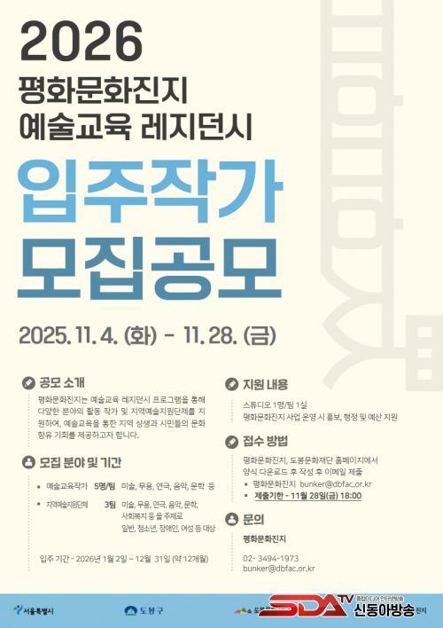 [½Åµ¿¾Æ¹æ¼Û µµºÀ±¸=À̽ŵ¿±âÀÚ] ¼­¿ï µµºÀ±¸ µµºÀ¹®È­Àç´Ü ÆòÈ­¹®È­ÁøÁö°¡ 11¿ù 28ÀϱîÁö ¡®2026³â ÆòÈ­¹®È­ÁøÁö ¿¹¼ú±³À° ·¹Áö´ø½Ã¡¯ ÀÔÁÖÀÛ°¡¸¦ ¸ðÁýÇÑ´Ù.
